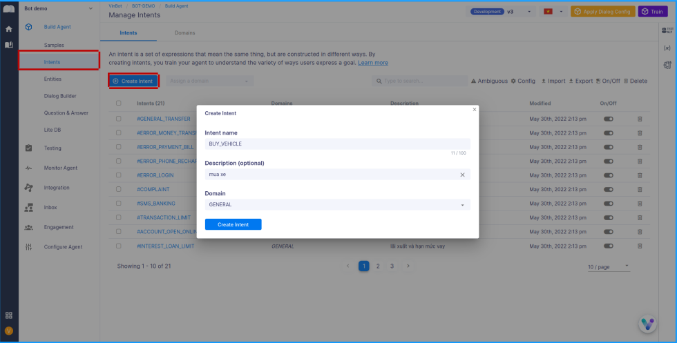 Domain: Nếu không có thông tin này, hệ thống tự thêm ý định vào Domain GENERAL.