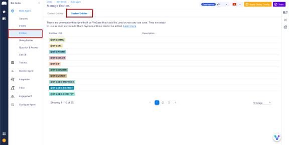 Hiện tại hệ thống vinbase.ai có khả năng phát hiện tự động 25 thực thể khác nhau trong cùng một câu mẫu được tại trên Chatbot. Bao gồm: Ngày, giờ, vị trí, tên người… Những Thực thể này sẽ được mô hình nhận dạng ngay lập tức, không cần đào tạo.